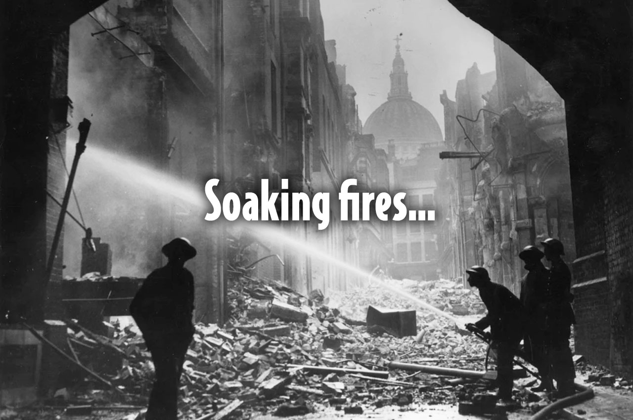 We were required to spend spells of duty in our section protecting buildings. We did this by watching for, and smothering, any incendiary bombs with sandbags, and soaking any fires that had started with our hand pumps whilst waiting for the Fire Brigade.